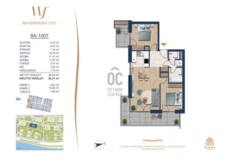 Projekt bemutatásaA projektrőlA Waterfront City egy új, modern városnegyed a 3. kerületben, ahol a természet közelsége és a városi kényelem tökéletes egyensúlyban van. A Duna-part közvetlen szomszédságában elhelyezkedő fejlesztés különleges atmoszférát kínál: a sétányt új épületek határolják, üzletekkel, kávézókkal és szolgáltatásokkal, amelyek élhető közösségi teret teremtenek.A 13 emeletes lakóépületből lenyűgöző örökpanoráma nyílik a budai hegyekre és a folyóra, a tágas teraszok pedig ideálisak a pihenéshez vagy a baráti összejövetelekhez. A zöldtetők, parkosított terek és fenntartható megoldások – mint az energiatakarékos rendszerek és okos otthon funkciók – mind hozzájárulnak a modern, környezettudatos életstílushoz.Látogass el értékesítési irodánkba, és tekintsd meg a városnegyed makettjét személyesen! Ismerd meg, milyen lesz az élet Budapest egyik legizgalmasabb új fejlesztésében!Óbuda szívébenKépzeld el, ahogy egy napsütéses délelőttön Óbuda szívében sétálsz, a Duna közelsége frissítően hat rád, miközben a Folyamőr utca, a Miklós tér és a Bogdáni út által határolt, öt hektáros területre érsz. A levegőben ott van a város történelme, mégis minden részletében a jövő hívogat.A 50 000 négyzetméteres területen egy hangulatos sétány vezet végig, amely egyenesen az óbudai Fő térre visz – mindössze 600 méterre. Ez a sétány nem csupán összeköt, hanem élményt nyújt: a Kolosy térről induló Óbudai Promenád részeként a város egyik legélhetőbb, legpezsgőbb szakaszán haladsz végig. És ha biciklivel érkeznél? A nemzetközi kerékpárút is itt halad el, Szentendre felé vezetve.Az 5. ütemben épülő 149 lakás mindegyike egyedi hangulatot kínál. Ahogy belépsz egy-egy otthonba, a hatalmas üvegfelületeken át beáradó fény és a tágas, szellős terek azonnal magukkal ragadnak. A kilátás? A Kaszap István park zöldje nyújt békét, míg a felsőbb emeletekről a Budai-hegység örökpanorámája tárul eléd – minden nap egy új festmény az ablakodban.A 6. ütemben 316 modern lakás épül, tágas teraszokkal és lenyűgöző kilátással a Dunára és a budai hegyekre. A lakók kényelmét őrszolgálat, kamerarendszer, mélygarázs, vendéglátóhelyek, belső park, játszótér és E-autó töltők szolgálják. Ez a projekt utolsó üteme, amely még közvetlen Duna-parti kapcsolattal rendelkezik.