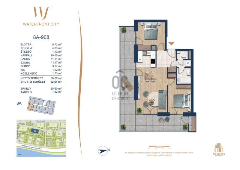 Projekt bemutatásaA projektrőlA Waterfront City egy új, modern városnegyed a 3. kerületben, ahol a természet közelsége és a városi kényelem tökéletes egyensúlyban van. A Duna-part közvetlen szomszédságában elhelyezkedő fejlesztés különleges atmoszférát kínál: a sétányt új épületek határolják, üzletekkel, kávézókkal és szolgáltatásokkal, amelyek élhető közösségi teret teremtenek.A 13 emeletes lakóépületből lenyűgöző örökpanoráma nyílik a budai hegyekre és a folyóra, a tágas teraszok pedig ideálisak a pihenéshez vagy a baráti összejövetelekhez. A zöldtetők, parkosított terek és fenntartható megoldások – mint az energiatakarékos rendszerek és okos otthon funkciók – mind hozzájárulnak a modern, környezettudatos életstílushoz.Látogass el értékesítési irodánkba, és tekintsd meg a városnegyed makettjét személyesen! Ismerd meg, milyen lesz az élet Budapest egyik legizgalmasabb új fejlesztésében!Óbuda szívébenKépzeld el, ahogy egy napsütéses délelőttön Óbuda szívében sétálsz, a Duna közelsége frissítően hat rád, miközben a Folyamőr utca, a Miklós tér és a Bogdáni út által határolt, öt hektáros területre érsz. A levegőben ott van a város történelme, mégis minden részletében a jövő hívogat.A 50 000 négyzetméteres területen egy hangulatos sétány vezet végig, amely egyenesen az óbudai Fő térre visz – mindössze 600 méterre. Ez a sétány nem csupán összeköt, hanem élményt nyújt: a Kolosy térről induló Óbudai Promenád részeként a város egyik legélhetőbb, legpezsgőbb szakaszán haladsz végig. És ha biciklivel érkeznél? A nemzetközi kerékpárút is itt halad el, Szentendre felé vezetve.Az 5. ütemben épülő 149 lakás mindegyike egyedi hangulatot kínál. Ahogy belépsz egy-egy otthonba, a hatalmas üvegfelületeken át beáradó fény és a tágas, szellős terek azonnal magukkal ragadnak. A kilátás? A Kaszap István park zöldje nyújt békét, míg a felsőbb emeletekről a Budai-hegység örökpanorámája tárul eléd – minden nap egy új festmény az ablakodban.A 6. ütemben 316 modern lakás épül, tágas teraszokkal és lenyűgöző kilátással a Dunára és a budai hegyekre. A lakók kényelmét őrszolgálat, kamerarendszer, mélygarázs, vendéglátóhelyek, belső park, játszótér és E-autó töltők szolgálják. Ez a projekt utolsó üteme, amely még közvetlen Duna-parti kapcsolattal rendelkezik.