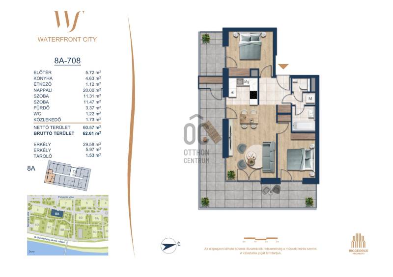 Projekt bemutatásaA projektrőlA Waterfront City egy új, modern városnegyed a 3. kerületben, ahol a természet közelsége és a városi kényelem tökéletes egyensúlyban van. A Duna-part közvetlen szomszédságában elhelyezkedő fejlesztés különleges atmoszférát kínál: a sétányt új épületek határolják, üzletekkel, kávézókkal és szolgáltatásokkal, amelyek élhető közösségi teret teremtenek.A 13 emeletes lakóépületből lenyűgöző örökpanoráma nyílik a budai hegyekre és a folyóra, a tágas teraszok pedig ideálisak a pihenéshez vagy a baráti összejövetelekhez. A zöldtetők, parkosított terek és fenntartható megoldások – mint az energiatakarékos rendszerek és okos otthon funkciók – mind hozzájárulnak a modern, környezettudatos életstílushoz.Látogass el értékesítési irodánkba, és tekintsd meg a városnegyed makettjét személyesen! Ismerd meg, milyen lesz az élet Budapest egyik legizgalmasabb új fejlesztésében!Óbuda szívébenKépzeld el, ahogy egy napsütéses délelőttön Óbuda szívében sétálsz, a Duna közelsége frissítően hat rád, miközben a Folyamőr utca, a Miklós tér és a Bogdáni út által határolt, öt hektáros területre érsz. A levegőben ott van a város történelme, mégis minden részletében a jövő hívogat.A 50 000 négyzetméteres területen egy hangulatos sétány vezet végig, amely egyenesen az óbudai Fő térre visz – mindössze 600 méterre. Ez a sétány nem csupán összeköt, hanem élményt nyújt: a Kolosy térről induló Óbudai Promenád részeként a város egyik legélhetőbb, legpezsgőbb szakaszán haladsz végig. És ha biciklivel érkeznél? A nemzetközi kerékpárút is itt halad el, Szentendre felé vezetve.Az 5. ütemben épülő 149 lakás mindegyike egyedi hangulatot kínál. Ahogy belépsz egy-egy otthonba, a hatalmas üvegfelületeken át beáradó fény és a tágas, szellős terek azonnal magukkal ragadnak. A kilátás? A Kaszap István park zöldje nyújt békét, míg a felsőbb emeletekről a Budai-hegység örökpanorámája tárul eléd – minden nap egy új festmény az ablakodban.A 6. ütemben 316 modern lakás épül, tágas teraszokkal és lenyűgöző kilátással a Dunára és a budai hegyekre. A lakók kényelmét őrszolgálat, kamerarendszer, mélygarázs, vendéglátóhelyek, belső park, játszótér és E-autó töltők szolgálják. Ez a projekt utolsó üteme, amely még közvetlen Duna-parti kapcsolattal rendelkezik.