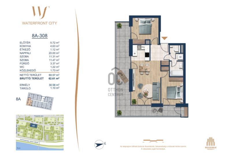 Projekt bemutatásaA projektrőlA Waterfront City egy új, modern városnegyed a 3. kerületben, ahol a természet közelsége és a városi kényelem tökéletes egyensúlyban van. A Duna-part közvetlen szomszédságában elhelyezkedő fejlesztés különleges atmoszférát kínál: a sétányt új épületek határolják, üzletekkel, kávézókkal és szolgáltatásokkal, amelyek élhető közösségi teret teremtenek.A 13 emeletes lakóépületből lenyűgöző örökpanoráma nyílik a budai hegyekre és a folyóra, a tágas teraszok pedig ideálisak a pihenéshez vagy a baráti összejövetelekhez. A zöldtetők, parkosított terek és fenntartható megoldások – mint az energiatakarékos rendszerek és okos otthon funkciók – mind hozzájárulnak a modern, környezettudatos életstílushoz.Látogass el értékesítési irodánkba, és tekintsd meg a városnegyed makettjét személyesen! Ismerd meg, milyen lesz az élet Budapest egyik legizgalmasabb új fejlesztésében!Óbuda szívébenKépzeld el, ahogy egy napsütéses délelőttön Óbuda szívében sétálsz, a Duna közelsége frissítően hat rád, miközben a Folyamőr utca, a Miklós tér és a Bogdáni út által határolt, öt hektáros területre érsz. A levegőben ott van a város történelme, mégis minden részletében a jövő hívogat.A 50 000 négyzetméteres területen egy hangulatos sétány vezet végig, amely egyenesen az óbudai Fő térre visz – mindössze 600 méterre. Ez a sétány nem csupán összeköt, hanem élményt nyújt: a Kolosy térről induló Óbudai Promenád részeként a város egyik legélhetőbb, legpezsgőbb szakaszán haladsz végig. És ha biciklivel érkeznél? A nemzetközi kerékpárút is itt halad el, Szentendre felé vezetve.Az 5. ütemben épülő 149 lakás mindegyike egyedi hangulatot kínál. Ahogy belépsz egy-egy otthonba, a hatalmas üvegfelületeken át beáradó fény és a tágas, szellős terek azonnal magukkal ragadnak. A kilátás? A Kaszap István park zöldje nyújt békét, míg a felsőbb emeletekről a Budai-hegység örökpanorámája tárul eléd – minden nap egy új festmény az ablakodban.A 6. ütemben 316 modern lakás épül, tágas teraszokkal és lenyűgöző kilátással a Dunára és a budai hegyekre. A lakók kényelmét őrszolgálat, kamerarendszer, mélygarázs, vendéglátóhelyek, belső park, játszótér és E-autó töltők szolgálják. Ez a projekt utolsó üteme, amely még közvetlen Duna-parti kapcsolattal rendelkezik.