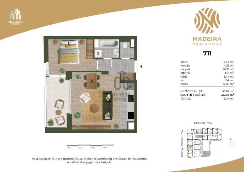 Projekt bemutatásaA projektrőlKépzeld el, ahogy belépsz Újbuda egyik legbékésebb, zöldövezeti utcájába, ahol a nyugalom átveszi a helyét a város zajos ritmusától. A Mérnök utcában, a Fehérvári út és az Etele út találkozásának közelében, egy elegánsan modern épület rajzolódik ki előtted – ez a Madeira Residence.Ahogy közelebb lépsz, a homlokzat letisztultsága, a loggiák ritmikus váltakozása azonnal megragadja a tekinteted. A pálcás korlátok finom eleganciát sugároznak, a napfény pedig játékosan tükröződik a teraszok üvegfelületein. Már kívülről is érezni: ez nem csupán egy lakóépület, hanem egy életérzés.Az első emeleti lakások egy része saját tetőkerttel rendelkezik – képzeld el, ahogy reggel a kávédat kortyolgatod a saját kis zöld oázisodban, miközben a madarak csicsergése tölti be a teret. Minden lakásban ott a tágas nappali, a kényelmes hálószobák, és a saját erkély vagy terasz, ahol a nap bármely szakában megpihenhetsz.A Madeira Residence nem csupán egy új építésű társasház – ez egy hely, ahol a modern életstílus találkozik a természet közelségével és a családbarát környezettel. Egy otthon, ahol minden nap élmény.A belső térben a kényelem és a fenntarthatóság kéz a kézben jár. A mennyezeti hűtés-fűtés rendszer csendesen gondoskodik a kellemes hőmérsékletről, az okosotthon-előkészítés pedig lehetővé teszi, hogy a technológia valóban a kényelmedet szolgálja. A mélygarázsban kényelmes parkolás vár, a kerékpártárolók és az elektromos autótöltési lehetőség pedig a környezettudatos életmódot támogatják.A környék infrastruktúrája kiváló: a közelben kiépített kerékpárutak, car sharing szolgáltatások és elektromos rollerek teszik egyszerűvé és fenntarthatóvá a közlekedést. A családosok számára külön öröm, hogy több játszótér is található a közelben – a gyerekek biztonságban, szabadon játszhatnak, miközben a szülők nyugodtan élvezhetik a környék nyugalmát.A Madeira Residence nem csupán egy új lakóépület – ez egy életérzés, ahol a mindennapok élménnyé válnak.