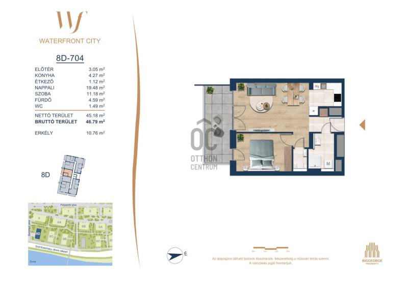 Projekt bemutatásaA projektrőlA Waterfront City egy új, modern városnegyed a 3. kerületben, ahol a természet közelsége és a városi kényelem tökéletes egyensúlyban van. A Duna-part közvetlen szomszédságában elhelyezkedő fejlesztés különleges atmoszférát kínál: a sétányt új épületek határolják, üzletekkel, kávézókkal és szolgáltatásokkal, amelyek élhető közösségi teret teremtenek.A 13 emeletes lakóépületből lenyűgöző örökpanoráma nyílik a budai hegyekre és a folyóra, a tágas teraszok pedig ideálisak a pihenéshez vagy a baráti összejövetelekhez. A zöldtetők, parkosított terek és fenntartható megoldások – mint az energiatakarékos rendszerek és okos otthon funkciók – mind hozzájárulnak a modern, környezettudatos életstílushoz.Látogass el értékesítési irodánkba, és tekintsd meg a városnegyed makettjét személyesen! Ismerd meg, milyen lesz az élet Budapest egyik legizgalmasabb új fejlesztésében!Óbuda szívébenKépzeld el, ahogy egy napsütéses délelőttön Óbuda szívében sétálsz, a Duna közelsége frissítően hat rád, miközben a Folyamőr utca, a Miklós tér és a Bogdáni út által határolt, öt hektáros területre érsz. A levegőben ott van a város történelme, mégis minden részletében a jövő hívogat.A 50 000 négyzetméteres területen egy hangulatos sétány vezet végig, amely egyenesen az óbudai Fő térre visz – mindössze 600 méterre. Ez a sétány nem csupán összeköt, hanem élményt nyújt: a Kolosy térről induló Óbudai Promenád részeként a város egyik legélhetőbb, legpezsgőbb szakaszán haladsz végig. És ha biciklivel érkeznél? A nemzetközi kerékpárút is itt halad el, Szentendre felé vezetve.Az 5. ütemben épülő 149 lakás mindegyike egyedi hangulatot kínál. Ahogy belépsz egy-egy otthonba, a hatalmas üvegfelületeken át beáradó fény és a tágas, szellős terek azonnal magukkal ragadnak. A kilátás? A Kaszap István park zöldje nyújt békét, míg a felsőbb emeletekről a Budai-hegység örökpanorámája tárul eléd – minden nap egy új festmény az ablakodban.A 6. ütemben 316 modern lakás épül, tágas teraszokkal és lenyűgöző kilátással a Dunára és a budai hegyekre. A lakók kényelmét őrszolgálat, kamerarendszer, mélygarázs, vendéglátóhelyek, belső park, játszótér és E-autó töltők szolgálják. Ez a projekt utolsó üteme, amely még közvetlen Duna-parti kapcsolattal rendelkezik.