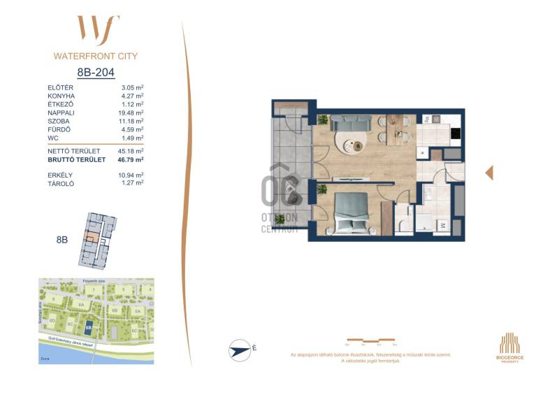 Projekt bemutatásaA projektrőlA Waterfront City egy új, modern városnegyed a 3. kerületben, ahol a természet közelsége és a városi kényelem tökéletes egyensúlyban van. A Duna-part közvetlen szomszédságában elhelyezkedő fejlesztés különleges atmoszférát kínál: a sétányt új épületek határolják, üzletekkel, kávézókkal és szolgáltatásokkal, amelyek élhető közösségi teret teremtenek.A 13 emeletes lakóépületből lenyűgöző örökpanoráma nyílik a budai hegyekre és a folyóra, a tágas teraszok pedig ideálisak a pihenéshez vagy a baráti összejövetelekhez. A zöldtetők, parkosított terek és fenntartható megoldások – mint az energiatakarékos rendszerek és okos otthon funkciók – mind hozzájárulnak a modern, környezettudatos életstílushoz.Látogass el értékesítési irodánkba, és tekintsd meg a városnegyed makettjét személyesen! Ismerd meg, milyen lesz az élet Budapest egyik legizgalmasabb új fejlesztésében!Óbuda szívébenKépzeld el, ahogy egy napsütéses délelőttön Óbuda szívében sétálsz, a Duna közelsége frissítően hat rád, miközben a Folyamőr utca, a Miklós tér és a Bogdáni út által határolt, öt hektáros területre érsz. A levegőben ott van a város történelme, mégis minden részletében a jövő hívogat.A 50 000 négyzetméteres területen egy hangulatos sétány vezet végig, amely egyenesen az óbudai Fő térre visz – mindössze 600 méterre. Ez a sétány nem csupán összeköt, hanem élményt nyújt: a Kolosy térről induló Óbudai Promenád részeként a város egyik legélhetőbb, legpezsgőbb szakaszán haladsz végig. És ha biciklivel érkeznél? A nemzetközi kerékpárút is itt halad el, Szentendre felé vezetve.Az 5. ütemben épülő 149 lakás mindegyike egyedi hangulatot kínál. Ahogy belépsz egy-egy otthonba, a hatalmas üvegfelületeken át beáradó fény és a tágas, szellős terek azonnal magukkal ragadnak. A kilátás? A Kaszap István park zöldje nyújt békét, míg a felsőbb emeletekről a Budai-hegység örökpanorámája tárul eléd – minden nap egy új festmény az ablakodban.A 6. ütemben 316 modern lakás épül, tágas teraszokkal és lenyűgöző kilátással a Dunára és a budai hegyekre. A lakók kényelmét őrszolgálat, kamerarendszer, mélygarázs, vendéglátóhelyek, belső park, játszótér és E-autó töltők szolgálják. Ez a projekt utolsó üteme, amely még közvetlen Duna-parti kapcsolattal rendelkezik.