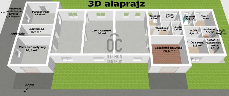 Recsken a község szélén 226nm-es ipari üzem, 15.000nm-es telken eladó. 1 km-re a 24-es főúttól.Recsk külterületének déli részén eladó jó állapotú ipari épület, hatalmas, nagyrészt aszfaltozott telken.Kizárólag az Otthon Centrum kínálatában!Az ingatlanhoz készült egy bemutatóvideó, a teljes ingatlant bemutatom rajta, megtekinthető az Otthon Centrum weboldalán.Az ingatlan 15.000 nm-es, azaz 1,5 hektáros teleken helyezkedik el, kiváló állapotú, nagy teherbírású útról közelíthető meg.Az épület téglából épült kb. a 2000-es években.Közművek víz, gáz, villany (3 fázisú ipari áram) bekötve, a szennyvíz derítőbe gyűlik.Az épület fűtéséről gáz-cirkó kazán is gondoskodik radiátorokon keresztül.Az ingatlan jelenleg nincs használva, üres, kulcsok nálam vannak, rugalmasan be tudom mutatni, de kérem, előbb nézze meg a bemutató videót.Az alaprajz és a 3D-s rajz is cm-re pontosan készült, ezeket a komoly érdeklődők rendelkezésére bocsátom a megtekintés után, hasznos lehet a tervezés és a berendezés során.Ha a hirdetés felkeltette az érdeklődését, vagy kérdése van, kérem hívjon a megadott telefonszámomon.Ingatlanirodánk teljeskörűen segíti az ingatlanok adásvételét, ügyvéd, bankfüggetlen hitelügyintéző, energetikus és a lelkes ingatlanközvetítő is rendelkezésére áll akár hétvégén, vagy ünnepnapokon is ;-)