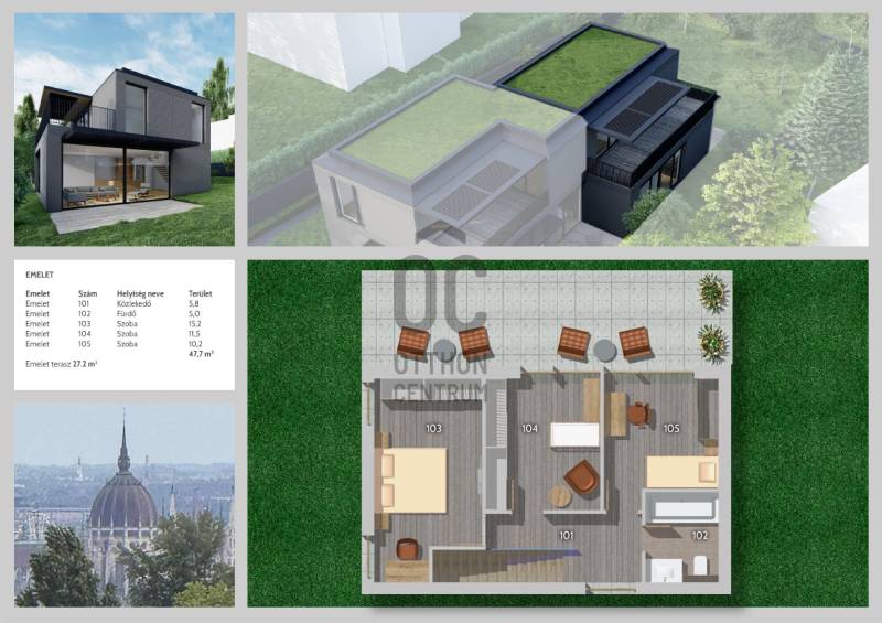 Fedezze fel ezt a kivételes adottságú, luxusminőségben kivitelezett, örökpanorámás otthont, amely a hegyoldal csendjét és Budapest egyik legkeresettebb városrészének kényelmét ötvözi. A közel 190 m²-es lakás hatalmas teraszokkal, privát kerttel, opcionálisan kültéri medencével és igény esetén kialakítható tetőterasszal kínál modern, kényelmes és jövőálló életteretPrémium műszaki tartalom – A++ energiahatékonyság, jövőálló megoldásokAz ikerházfél tervezésekor a magas minőség, az energiahatékony működés és a kényelmes mindennapok biztosítása volt a fő szempont. A kivitelezés és a gépészet minden elemében a legmodernebb technológiákat vonultatja fel.Energetika és gépészet:-A++ energiahatékonyság-DAIKIN hőszivattyús hűtés–fűtés-Padlófűtés minden helyiségben-Helyiségenként távolról szabályozható termosztát-ZENDER hővisszanyerős, páraszabályozós szellőztető rendszer(pollen- és porszűrővel)-Központi porszívó rendszerSzerkezet és nyílászárók:-15 cm külső hőszigetelés-3 rétegű ALUPROF emelő-toló nyílászárók-Motoros fixscreen árnyékolók előkészítésOkosotthon és biztonság:-Okosotthon-előkészítés-Automata öntözőrendszer előkészítés-Riasztó- és kamerarendszer előkészítés-Okos ajtó távoli ujjlenyomat-vezérlésselMegjelenés és külső terek:-Egyedi, modern, letisztult homlokzati design-Nagyméretű, panorámás teraszok: 12 m², 27 m², 27,2 m²-Saját, 386 m²-es privát kert-Opcionálisan 3×7 m-es kültéri medenceLokáció – Zöldövezeti luxus a budai hegyek ölelésében:Az ikerházfél Budapest III. kerületének egyik legkedveltebb, nyugodt mellékutcájában található. A környék ideális azoknak, akik egyszerre szeretnének csendes, természetközeli környezetben élni, mégis közel maradni a városi infrastruktúrához.Környezeti és életmódbeli előnyök:Hegyvidéki, exkluzív, csendes környezetÖrökpanorámás kilátás – a környék sport- és zöldterületeire isKiváló levegőminőségNyugodt családi házas övezet, minimális forgalommalKözeli túra- és futóútvonalak, panorámás sétalehetőségekGolf, kerékpár, természetjárás – sportos életmódnak ideálisInfrastruktúra és közlekedés:Pár perc autóval a GOBUDA Mall, Stop Shop, Kolosy tér, Óbuda főtereGyors közlekedési kapcsolatok — autóval és tömegközlekedéssel isKözelben elérhető a British International School, így családok számára kiemelten kedvezőBölcsődék, óvodák, iskolák, orvosi rendelők, sportlétesítmények – minden könnyen elérhető--------------Az ikerházfél elrendezése – Funkcionális, háromszintes kialakítás:GARÁZS SZINT – 29 m²A ház praktikus kiszolgálószintje, amely tehermentesíti a lakótereket:-Wellness helyiség-Mosókonyha-Gardrób / tárolóTökéletes helyszín edzéshez, mosáshoz, szezonális tároláshoz és wellness funkciókhoz.FÖLDSZINT – 76,8 m² + 12 m² és 27 m² teraszokA földszint a közösségi élet tere – panorámás nappalival, fantasztikus kertkapcsolattal és nagy üvegfelületekkel.Innen nyílik a saját, 386 m²-es kert, ahol akár medence is kialakítható.Helyiségek:-Előtér (4,7 m²)-WC (1,8 m²)-Gardrób (5,1 m²)-Fürdő (4,4 m²)-Hálószoba (11,4 m²) – ideális vendég- vagy dolgozószoba-Amerikai konyhás nappali (49,4 m²) – közvetlen teraszkapcsolattalKét irányba is teraszok nyílnak, így a kert több funkcionális részre is tagolható: napozóterasz, kültéri étkező, pihenőkert vagy játszórész.EMELET – 47,7 m² + 27,2 m² teraszA felső szint a család privát élettere, csodás panorámával.Helyiségek:-Közlekedő (5,8 m²)-Fürdő (5,0 m²)-Szoba (15,2 m²)-Szoba (11,5 m²)-Szoba (10,2 m²)A hatalmas, panorámás terasz tökéletes a reggeli kávéhoz, napozáshoz vagy esti pihenéshez, és igény esetén akár tetőterasz továbbfejlesztése is megoldható.PARKOLÁS:2 db teremgarázshely(kötelezően megvásárolandó – 2 × 14 M Ft)Tervezett átadás: 2026 I. negyedév