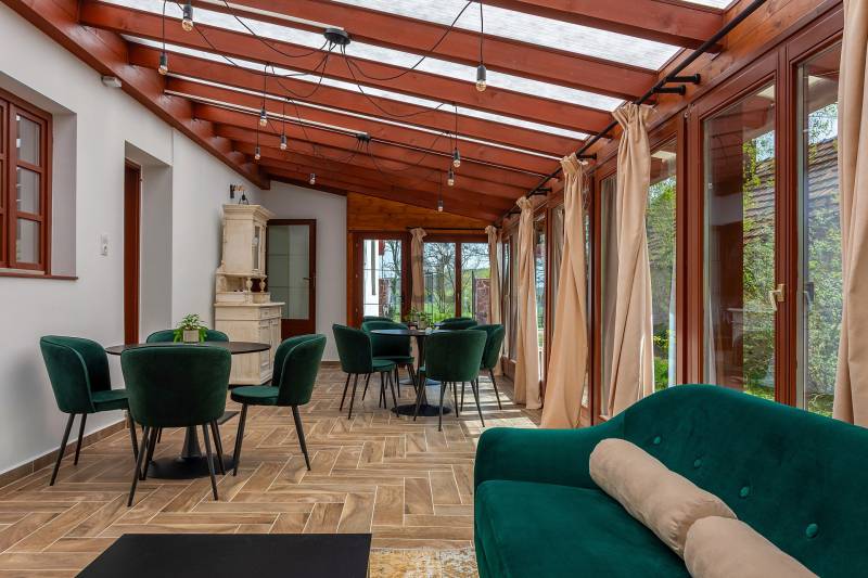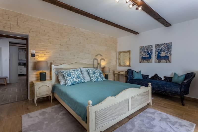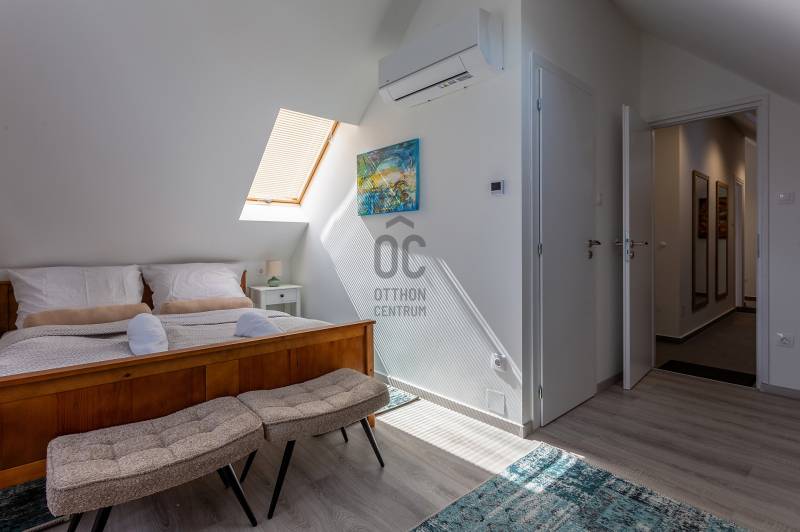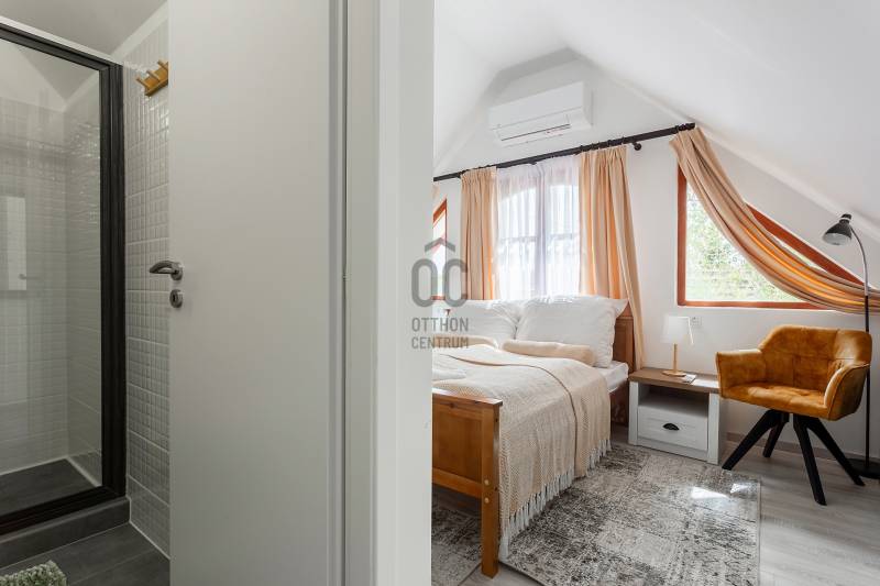 Balaton északi partján, csodállatos természetközeli településen Kékkúton kínálunk megvételre egy felújított többgenerációs családi házat.A 221 m²-es, kétszintes, teljes körűen felújított lakóház besorolású ingatlan a Balatontól mindössze pár percre található, 1460 m²-es parkosított telken!Az épület kőből épült, kívülről 12 cm szigeteléssel ellátott, tetőtere beépített. A korszerűsítés során új villamos- és vízhálózat került kiépítésre. A nyílászárók fából vannak és hőszigetelt üveggel ellátottak. A tető cserépfedésű, szigetelt.Az ingatlan elrendezése lehetővé teszi több család kényelmes együttélését valamint szálláshelyként való üzemeltetését is.ELRENDEZÉSEFöldszint:*Első lakórész: gépesített, tágas konyha-étkező, 1 hálószoba, fürdőszoba, külön mosókonyha/tároló*Fedett télikert: az épület két része között, kiváló közösségi tér, reggeliző- és kávézóterasz *További helyiségek: közös konyha feljárattal az emeletre, fürdőszoba WC-vel, közlekedő, szoba, gépészetEmelet: *3 külön bejáratú szoba, mindegyik saját fürdőszobával és WC-vel, közlekedő/közösségi térModern, energiahatékony megoldások: Elektromos padlófűtés és melegvíz ellátás hőtárolós rendszerrel Kályha az első lakótérben 5 db hűtő-fűtő klíma Napelemrendszer – alacsony fenntartási költség 3×32 A áramerősségKívül-belül rendezett Elektromos kapuval ellátott bejárat Elöl térkövezett udvar Hátul parkosított kert: gyümölcsfák, kerti tó, füvesített pihenőtérExtrák: Szauna, kültéri dézsafürdő Igényesen berendezés, vadonatúj minőségi bútorokkal Udvaron napernyők, nyugágyak, kerti bútorok és hinta Az ingatlan kiváló befektetés, szuper lehetőség, hogy egyben egy jövedelmező családi vállalkozásra tegyen szert.Kékkút a Káli-medence egyik legnyugodtabb és legszebb települése, a Theodora-forrás szomszédságában. Kiváló választás, ha otthonát a természethez közel, de mégis a Balaton közelségében szeretné megtalálni – akár magáncélra, akár üzleti befektetésként.Érdeklődjön most – ne maradjon le erről a páratlan lehetőségről!