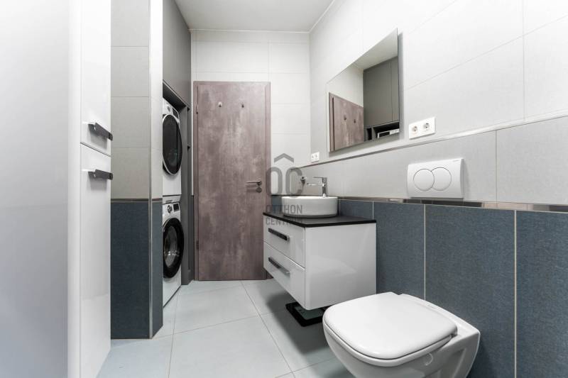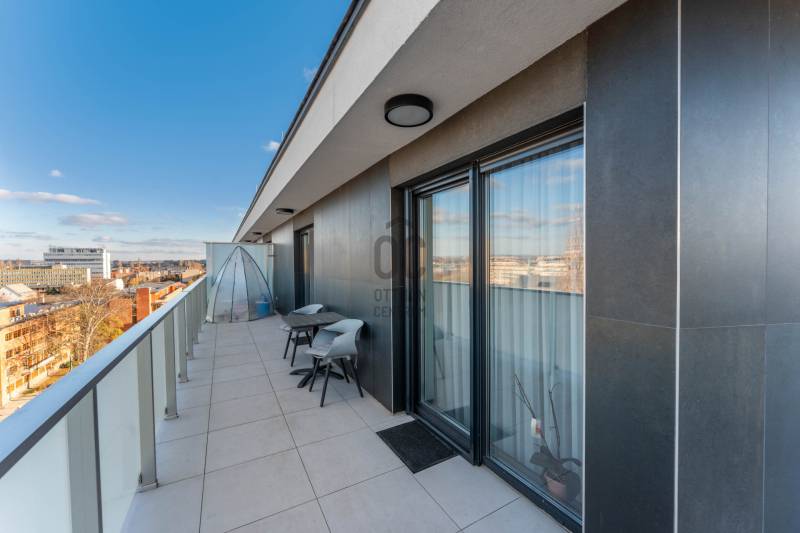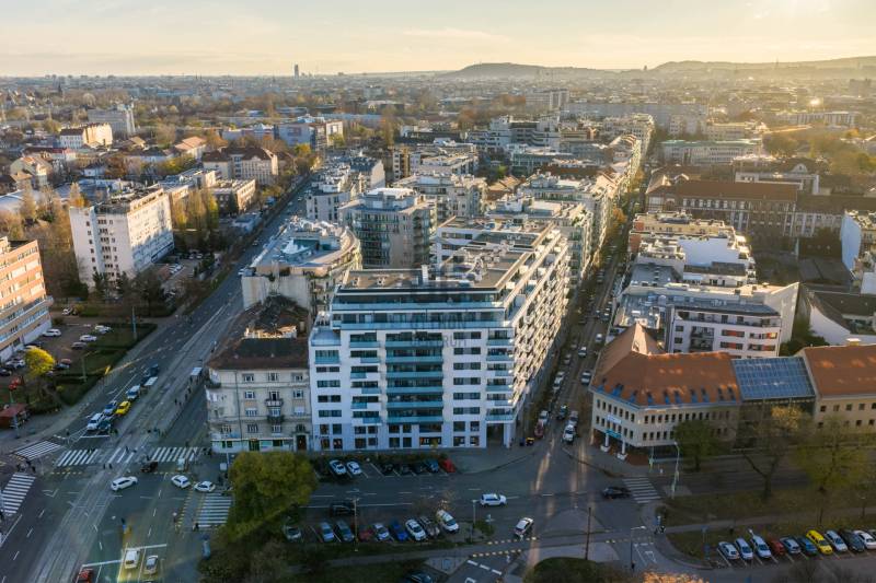 Minden nap ugyanaz a kérdés: miért nem költöztél ide előbb? Üdv itthon!RÖVID ÖSSZEFOGLALÓ Budapest XIII. kerületében, Angyalföld egyik legújabb fejlesztésében, a 2023-ban átadott Béke Residence-ben található ez a 70 m²-es, nappali + két hálós penthouse lakás, 44 m²-es, teljes hosszban futó terasszal és elvehetetlen panorámával a Budai Várra, a Normafára és a Szent László templomra.A 9. emeleti otthon teljesen bútorozott, tehermentes, mennyezeti hűtés–fűtés rendszerrel működik, és azonnal költözhető.A lakáshoz garázs és tároló tartozik, melyek együtt 15 M Ft-ért vásárolhatók meg.A közös költség 34 000 Ft.ELHELYEZKEDÉS – XIII. KERÜLET, BÉKE TÉRAngyalföld ezen része olyan környék, ahol elsőre feltűnik a rendezettség: széles utcák, sok fény, átlátható terek és egyfajta természetes könnyed ritmus, amibe gyorsan beleszeret az, aki itt él. Nem túl zsúfolt, nem túl zajos — inkább olyan, ahol a városi lét előnyei és az otthonos környezet közti egyensúly magától értetődő. A Rákos-patak sétánya pár perces távolságban indul, - mintha a városban nyílna egy rövid, zöld menekülőút: alkalmas egy gyors levegőzésre munka után, egy kis biciklizésre a gyerekekkel, vagy akár egy hétvégi kellemes sétához ebéd után. A Béke téri park és a Rokolya játszótér a helyiek számára biztos pont — ott mindig történik valami, gyerekzsivaj, mozgás, élet.Bevásárlásnál sem kell kompromisszumot kötni: a Lidl, Aldi, Spar, DM vagy Rossmann mind perceken belül elérhetők, a Lehel Csarnok pedig rövid autóúttal kapcsol a város egyik legjobb piacához. A Fáy utcai piac külön fejezet: szombatonként sajátos kerületi hangulat tölti meg, friss termelői áruk és ismerős arcok keverékével.A sportolási lehetőségek kifejezetten jók: a Vasas pályái, a Tichy Lajos Sportcentrum vagy a Kaffka Margit téri szabadtéri fitneszpark mind olyan helyek, amelyek megkönnyítik, hogy a mozgás ne hétvégi projekt legyen, hanem része maradjon a napi ritmusnak.Közlekedni egyszerű: a 14-es villamos két perc séta, és gyorsan összeköt a Váci úttal. A buszjáratok a Westend és a Nyugati felé visznek pár megálló alatt, a Lehel téri metró pedig rövid autóúttal elérhető. Innen elindulni és ide visszaérkezni is könnyű — talán ez az egyik legnagyobb előnye a Béke térnek, hogy minden úgy van közel, ahogy jólesik.AZ ÉPÜLET – MODERN, LETISZTULT, BIZTONSÁGOSA Béke Residence egy friss, modern épület: átgondolt közös terekkel, tágas liftekkel, jól kialakított garázsszinttel és kamerarendszerrel. A homlokzat letisztult, a lépcsőház világos, a lakóközösség igényes. Hangulatos, modern, rendezett ház, fiatalos és értéktartó — jó érzés megérkezni.ÚJ OTTHONOD BELSŐ VILÁGA Már az előszoba is jelzi, hogy itt minden részlet összehangolt. A szürke és kék árnyalatok visszafogott eleganciája végigkíséri az egész lakást, a mozgásérzékelős LED fények pedig diszkrét ritmust adnak a tereknek.A nappali a lakás legnyitottabb pontja: nagy üvegfelületein át folyamatosan érkezik a természetes fény, amely könnyed, levegős hangulatot ad a térnek.Napközben szinte észrevétlenül válik eggyé a lakás a terasszal; a két helyiség közötti átmenet olyan természetesen működik, mintha a külső és belső tér határai elmosódnának.Középen az Olaszországból érkezett pet-proof kanapé áll, első pillantásra is minőségi darab, használat közben pedig pontosan annyira kényelmes, amennyire várnád. Mellette az infinity bárszekrény és a borhűtő tesz hozzá egy visszafogott, mégis karakteres részletet; olyan funkcionális kiegészítők, amelyek idővel válnak az otthon kedvenc pontjaivá.A tárolókapacitás rendkívül erős: 30–40 pár cipő elhelyezésére alkalmas rendszer, ruhaliftes szekrények és több, padlótól plafonig futó beépített gardrób gondoskodik arról, hogy minden rendszerezve maradjon – ezek a megoldások a lakás praktikus oldalát hangsúlyozzák, és hosszú távon is hatalmas előnyt jelentenek. Letisztult, modern hangulat fogad a fürdőben: a nagyméretű szürke burkolatok nyugodt, rendezett hátteret adnak, a fehér szaniterek pedig tiszta kontrasztot teremtenek. A beépített kád kényelmes méretű, fölötte üvegfallal elválasztott zuhanykeret ad praktikus pluszt, így a helyiség két funkciót is gond nélkül kiszolgál.A mosdópult fekete felülete elegáns, a fali tárolók pedig elrejtik a mindennapi eszközöket, ettől marad a tér vizuálisan könnyű. Kényelmes részlet a törölközőszárítós radiátor, amely a hűvösebb napokon gyors melegedést biztosít, a szoba teljes ritmusa pedig olyan átgondolt, hogy könnyű benne elindítani vagy éppen lezárni a napot.A konyhában a TechniStone munkapult stabil, letisztult felülete adja a magabiztos alapot, amely jól bírja a mindennapi rutint. Beépített Bosch gépek dolgoznak csendesen és megbízhatóan, a konyha elrendezése pedig úgy lett kialakítva, hogy tényleg kézre álljon minden.A nappalira nyitott étkező természetes átmenetet képez a terek között; ez az a rész, ahol a napok ritmusában helyet kapnak a gyors reggelik, a nyugodtabb családi vacsorák és az elnyúló esti beszélgetések is.A lakás két hálója külön életet él, még ha nem is azonos mértékben szeparáltak. A terek elrendezése jól átgondolt: az egyik háló a központi nappali folytatása, a másik pedig ettől távolabb, a lakás csendesebb oldalán helyezkedik el. Ez a finom elválás biztosítja, hogy mindkét szoba valódi saját funkciót kaphasson.A nagyobb háló az otthon nyugodtabb, intim részén található. Pasztell árnyalatai miatt meleg és barátságos, a falra helyezett festmény pedig karaktert ad a térnek. A beépített, padlótól plafonig futó szekrények rendezett keretet
