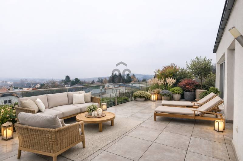 Kinek ajánlomEzt az ingatlant azoknak ajánlom, akik az otthont nem pusztán élettérnek, hanem harmóniát adó helynek tekintik.Akik szeretik, ha reggel a napfény tölti meg a szobákat, ha este a városi fényekkel a horizonton pihennek meg, és fontos számukra a nyugalom, a panoráma és a minőség.Ideális választás családoknak, pároknak, vagy akár elfoglalt szakembereknek, akik egy rendezett, zöldövezeti környezetben szeretnének élni — kompromisszumok nélkül.ElhelyezkedésAz ingatlan Budaörs egyik legkedveltebb, dombos részén található, zöldövezeti, mégis kiválóan megközelíthető környezetben.A városközpont, valamint a legfontosabb bevásárlási lehetőségek – IKEA, Auchan, Tesco, Decathlon, Rossmann, gyógyszertárak – mind néhány perces autóútra elérhetők.Több iskola, óvoda és sportlétesítmény is a közelben található, a tömegközlekedés pedig kényelmesen használható: helyi buszjáratok biztosítanak kapcsolatot a budaörsi központ és Budapest irányába.Az M1–M7 autópályák csomópontja mindössze pár percre található.A környék hangulataA budaörsi dombvidék egyik legcsendesebb és legápoltabb része.A környék atmoszférája nyugalmat és természetközelséget sugároz, miközben modern, igényes családi házak és új építésű társasházak veszik körül.A környék ideális választás azoknak, akik szeretik a reggeli sétákat, a friss levegőt, a csendes esték békéjét, és akik számára fontos, hogy a panoráma valóban elvehetetlen maradjon.Az ingatlanrólA lakás egy kétlakásos társasház felső szintjén helyezkedik el – így teljes intimitást és privát életteret biztosít.A ház elhelyezkedéséből adódóan 180 fokos, körpanorámás kilátás tárul elénk, amely a nappaliból, a teraszról és a kertből is élvezhető.A lakás különlegessége a 33 m²-es, üvegkorlattal ellátott panorámaterasz, ahol minden napszakban más arcát mutatja a kilátás.A tágas, egybenyitott nappali–étkező–konyha térben hatalmas üvegfelületek engedik be a fényt, így a lakás egész nap napfényben úszik.A három hálószoba közül a legnagyobb közvetlen kertkapcsolattal rendelkezik.A házhoz privát úton lehet feljutni, ami biztonságot és nyugalmat ad, a környezet pedig rendezett és igényes.Műszaki felszereltségÉpítés éve: 2018Fa nyílászárók, prémium hőszigetelésselHőszivattyús hűtés–fűtés rendszer, alacsony fenntartási költségekkelBeépített konyhabútor és beépített gardróbszekrényekFrissen tisztított, üres állapot, azonnal költözhetőModern, igényes kivitelezés, időtálló anyaghasználatParkolás és megközelítésA lakáshoz tartozik egy 30 m²-es, zárható, privát garázs, amely kizárólag az ingatlan tulajdonosának használatában van.Ezen felül a telken belül további 2–3 felszíni beállóhely is rendelkezésre áll.A ház privát úton közelíthető meg, ami exkluzivitást és biztonságot nyújt a lakók számára.Ez az otthon egyszerre sugároz letisztultságot, harmóniát és eleganciát – egy hely, ahol minden részlet a kényelmet és a nyugalmat szolgálja.Ha felkeltette az érdeklődését, keressen bizalommal, örömmel mutatom be személyesen is ezt a különleges ingatlant.