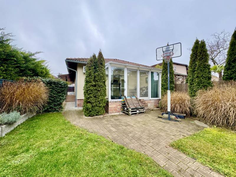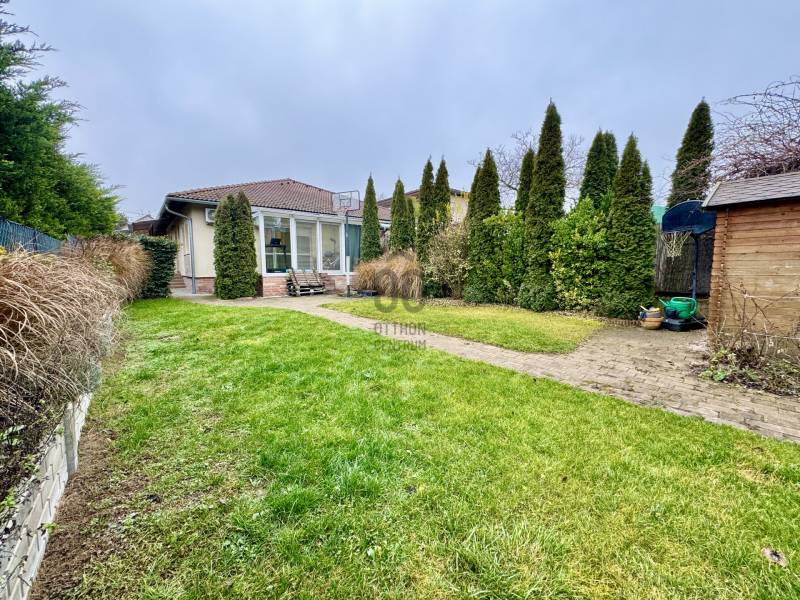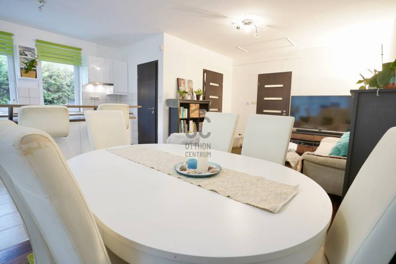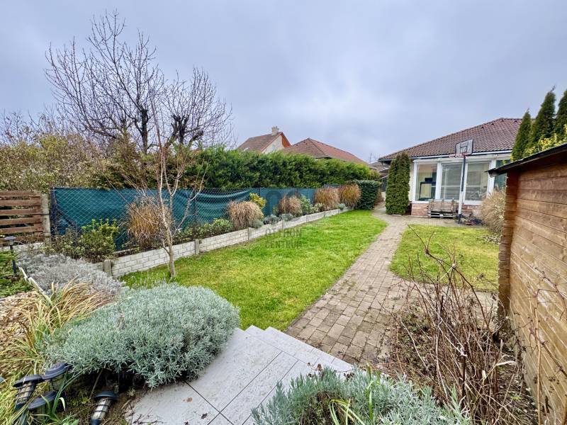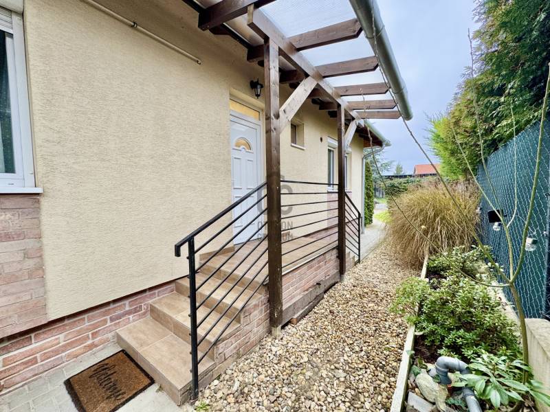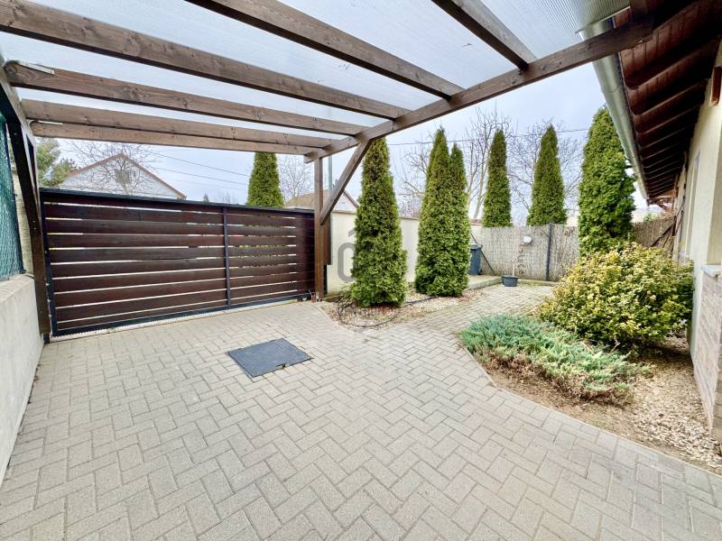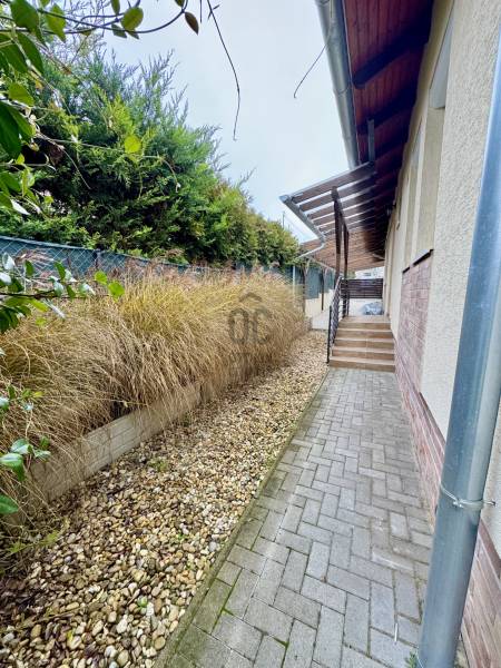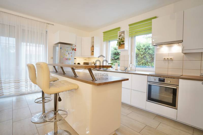 Eladó sorba került egy 110 m²-es ikerházfél Dunakeszi Alsó egyik csendes utcájában, 6 perc sétára a vasútállomástól és buszmegállótól.A Szabadságliget egyik legkedveltebb, csendes, átmenő forgalomtól mentes utcájában helyezkedik el ez a modern, 90 m²-es téglaépítésű ikerházfél, amelyhez egy 13,5 m²-es fűthető télikert, valamint a kertben egy különálló, összkomfortos, 20 m²-es könnyűszerkezetes apartmanház is tartozik.A FŐÉPŰET:A ház 2015-ben épült, 10 cm-es külső hőszigeteléssel, cseréptetővel, műanyag nyílászárókkal, minőségi burkolatokkal, mozgás- és nyitásérzékelő riasztórendszerrel. A melegvízről és a fűtésről Ariston kombi cirkó kazán, a hűtésről és rásegítő fűtésről Gree hűtő-fűtő klíma gondoskodik. A radiátoros és padlófűtés kombinációja kellemes, energiatakarékos hőérzetet biztosít, minden helyiségben redőny van, az ablakokon pedig szúnyogháló. A MELLÉKÉPÜLET:A kert hátsó részén található egy könnyűszerkezetes, hőszigetelt és teljesen önálló 20 nm-es vendégház, amely:- saját szobával,- külön konyhával,- zuhanyzós, beépített WC-vel felszerelt fürdővel,- valamint elektromos padlófűtéssel és klíma előkészítéssel rendelkezik.A melegvizet itt is Ariston, víztartályos villanybojler biztosítja, így az épület teljesen független a főépület rendszereitől. A vendégházhoz tartozik egy 17 m²-es fedett terasz, valamint egy füvesített, sziklakertes pihenő- és sütögető rész is.RENDEZETT, GONDOZOTT KERT:- automata öntözőrendszer- kerti csap- térkövezett, napelemes megvilágított közlekedőfelületek- 3 autó számára fedett beálló közvetlenül a ház mellett- szépen karbantartott gyep, dísznövényekkel beültetett magaságyás, sziklakert és 10-15 éves, magas tujákKIVÁLÓ KÖZLEKEDÉS:- vonattal 18 perc alatt elérhető a Nyugati pályaudvar,- busszal 3 perc Újpest–Káposztásmegyer,- autóval néhány perc alatt elérhető az M2-es, M3-as és az M0-s autópálya.Iá.: 169,5 M Ft.