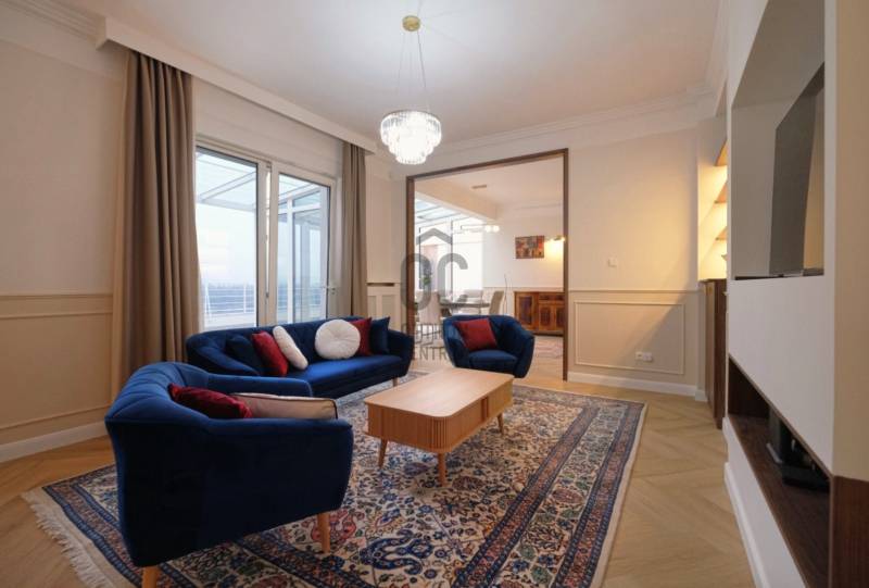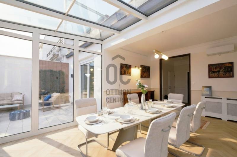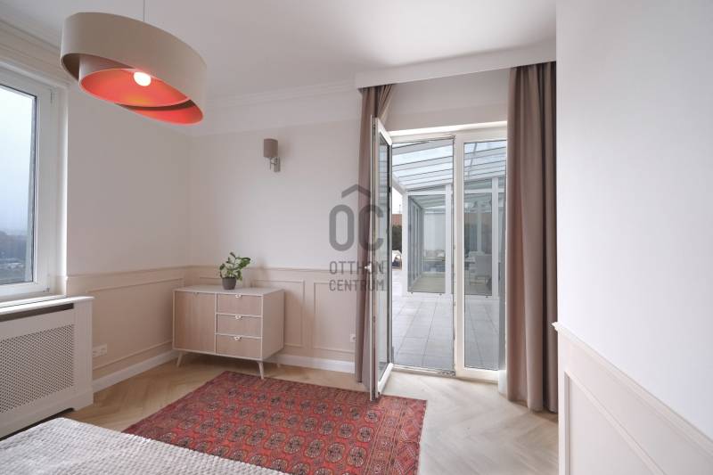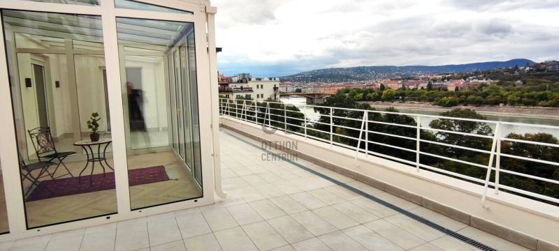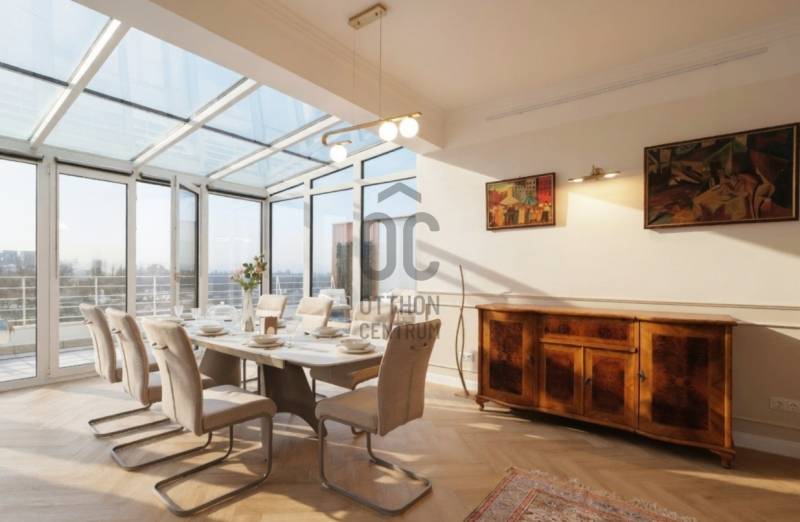 Penthouse a Szent István park felett – Margitsziget-panoráma, 50 m²-es tetőterasz, luxus Újlipótváros szívébenA 110 m²-es, belsőépítész által megálmodott otthon a kifinomult dizájn és a mindennapi kényelem kiegyensúlyozott elegyét kínálja. A lakás szíve az üvegfalú télikert-étkező, ahol télen-nyáron természetes fényben élvezheti a Dunára és a budai hegyekre nyíló kilátást.A tágas belső terek mellett hatalmas privát tetőterasz várja kültéri zuhannyal – ideális hely a város feletti pihenéshez. A lakásban 2 hálószoba, 2 fürdőszoba és egy nagy méretű nappali található, és válogatott prémium bútorokkal berendezett és gépesített. (A bútorok egy része a fotókon még nem látható.)– 110m² lakótér klimatizált üvegfalú télikert-étkezővel, 50m²-es tetőterasszal– Elsőrangú lokáció Újlipótvárosban a Pozsonyi út és a Szent István park mellett – Villamos: 4/6, trolibusz:75, 76, nem messze M3-as Metró, Nyugati Pu.-tol.– Örök panoráma a Szent István Parkra, a Margitszigetre és a budai hegyekre– Lifttel megközelíthető csendes legfelső szint - kerekesszékes használatra alkalmas– Prémium gépesítés, okostévé, okostelefonról vezérelhető klimatizálás és világítás– Távfelügyeletbe kötött riasztó, korszerű nyitás- és füstérzékelés– Parkolás közeli garázsban (bérlet része)– Otthonmenedzsment-asszisztencia (pl. tetőterasz ápolása) a bérlet része – takarítás igény szerintEz az ingatlan több mint lakás – életforma azoknak, akiknek fontos a tetőterasz és a télikert nyújtotta hangulat és a dunai horizont zavartalan látványa.Bérleti feltételekSzerződéskötéskor 2 havi kaució és 1 havi bérleti díj fizetendő.Minimum bérleti idő: 2026 július 31-igNemdohányzó ingatlan; szabadon mozgó kisállat nem hozhatóKözjegyzői okiratba foglalt kiköltözési nyilatkozatFelhívjuk figyelmét, hogy a képgaléria a lakás bútorozás előtti és utáni, berendezett állapotát is bemutatja, így a felvételek között eltérések tapasztalhatóak.