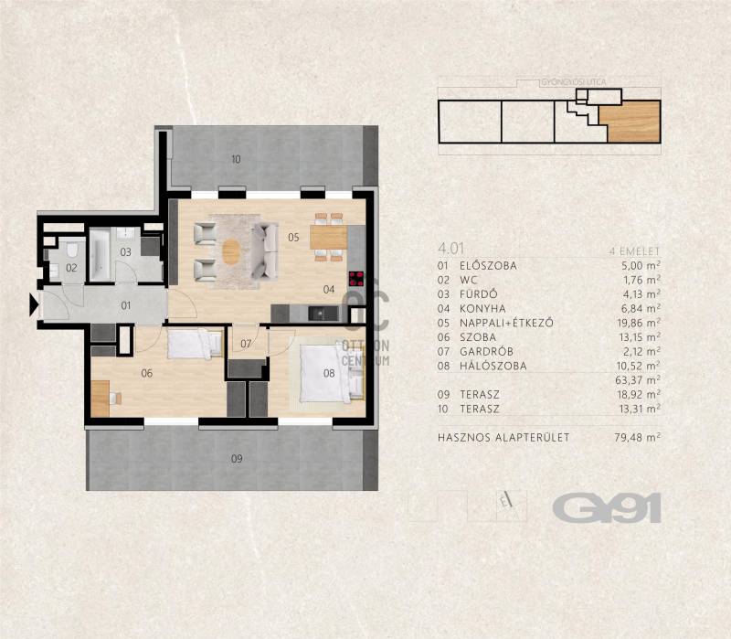 Projekt bemutatásaÚJ ÉPÍTÉSŰ MODERN LAKÁSOK A XIII. KERÜLETBENKiváló befektetési és lakhatási lehetőség Budapesten, a XIII. kerület frekventált, de nyugodt részén. Itt épül egy modern 31 lakásos, pince + földszint + 4 emelet kialakítású, elegáns, liftes társasház!Műszaki szempontból is a legmodernebb megoldásokat alkalmazzák az építés során, hiszen hőszivattyús fűtés és melegvíz ellátása van a lakásoknak, amihez párosulnak a három rétegű ablakok, és a megfelelő homlokzati szigetelés. Ezáltal a lakások fenntartási költsége nagyon kedvező lesz!A földszinti lakások egy része kertkapcsolattal rendelkezik, amely ideális választás lehet azoknak a vevőknek, akik kisállattal rendelkeznek vagy zöld környezetre vágynakKiemelt figyelmet érdemel a lakóépület legfelső, negyedik emelete, ahol az utcai és udvari homlokzati falak visszahúzása miatt:Tágas, napfényes teraszok kerülnek kialakításra.Penthouse jellegű lakások, melyek ideálisak a különleges hangulatot és kilátást keresők számára.Lehetőség van garázs beálló hely vásárlására a mélygarázsban, illetve tároló vásárlására is. Ha akezdeti szakaszban vásárol, akkor még lehetősége van a saját ízlése szerint kiválasztani a burkolatokat, ajtókat, szanitereket stb. ElhelyezkedésA Gyöngyösi utca kiváló infrastruktúrával rendelkezik, a közelben minden megtalálható, ami a kényelmes élethez szükséges (vásárlási lehetőségek, közlekedés, szolgáltatások).Ne maradjon le! Válassza ki álmai otthonát még az építkezés kezdeti szakaszában!Tervezett átadás 2027 IV. negyedévTovábbi információkért keressen minket bizalommal!