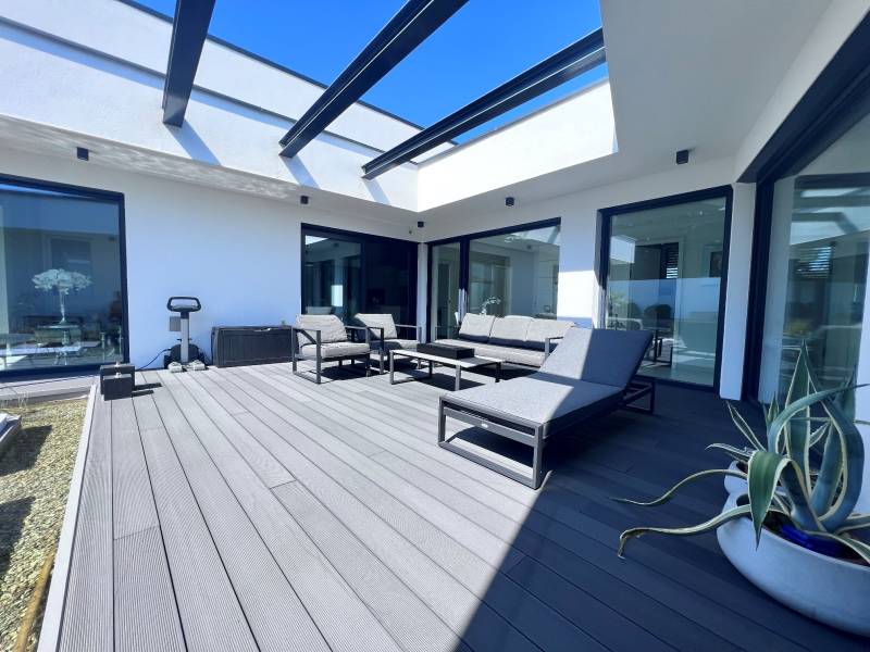Megvételre kínálunk, egy újszerű, kompromisszummentes, kiváló adottságokkal rendelkező, egyszintes, minimalista jegyekkel épült, 220 nm- alapterületű, nappali+3 hálószobás modern családi házat kétállásos garázzsal.A Lake Forest villaparkot egy Magyarországon egyedülálló vízió hozta létre, mégpedig egy erdő közepén elterülő letisztult és mintaszerű Modern családi házas környezet, a Villapark közepén kialakított 7000 nm-es dísztóval.A ház gondosan megtervezett, mind külső jegyei, mind a belső enteriőr vonzza a tekintetet. Prémium minőségű, építészeti megoldások mellett, magas műszaki tartalommal épült, a praktikum és az elegancia ihlette.A házról:A házba lépve már az előtérben szemet gyönyörködtető, az üveg felületeknek köszönhetően elénk táruló, a házat körülvevő privát kert és Bio tó. Az előtérből jobbra található az Amerikai konyhás nappali, szintén körbe üveg felülettel, egyedi gyártású, teljesen gépesített, prémium minőségű konyhabútorral. Az étkezőasztal mögött kapott helyet egy Bioetanol beépített látványkandalló is, ami szeparálja a pihenő nappalit, a páratlan, saját tóra és teraszra tájolva. A nappali a hálószobáktól teljesen elkülönül, a gondos tervezésnek köszönhetően.Az előtértől balra a közlekedőn át található egy vendég wc, tovább a gardrób szoba, melyből nyílik egy tágas kádas, ablakos fürdőszoba wc-vel. A közlekedőn át haladva az üvegfelületeken át az egész kert és a tó is elénk tárul, miközben elérjük a két külön nyíló gyermekszobát, továbbá a mosókonyhát. A gyermekszobák és a szülői háló között található a dolgozószoba, majd a szülői háló, saját gardróbbal, privát terasszal és fürdőszobával. Minden szobája kertkapcsolatos, a kert intimitása teret ad az aktív pihenésnek, mindezeken túl tetőterasz is kialakításra került.Komfort:A házban a 2 fürdőszobán túl további vendég wc és zuhany is kialakításra került.Műszaki tartalom:A ház falazata, 30 cm-es Porotherm falazat amely 20 cm-es Austrotherm Grafit fokozott hőszigeteléssel lett ellátva. A ház építése során a munkafolyamatok dokumentálva lettek, bővebb műszaki tájékoztatással személyesen állunk szíves rendelkezésükre.A gépészet:A fűtés padló és falfűtéssel lett kialakítva, a helyiségekben inverteles klíma berendezések biztosítják a hűtést-fűtést, a ház központi vízlágyító és víztisztító rendszerrel lett kiépítve. 10.5 kw teljesítményű napelem rendszer biztosítja a ház energiatakarékos fenntartását.Luxus kategóriájú Olasz hideg burkolatok kerültek beépítésre a fürdőszobákban és a közlekedőn, valamint a nappaliban. A szobákban egyedi színre pácolt tölgyfa parketta került, prémium szaniterekkel, csaptelepekkel, egyedi gyártású nyílászárókkal.Kert :A hatalmas Telek, lehetőséget nyújtott egy csodás privát kert, kényelmes terasz modern WPC burkolattal, saját BIO tó, grill terasz bioklimatikus motoros, vízálló pergolával (mely körbe LED világítással van felszerelve), a házhoz kapcsolódó tároló épület, kialakítására. A telek V-alakú formájából adódóan a hátsó kert tágas, egyedi méretének köszönhetően kellően nyugodt magánszférát és intimitást nyújt az otthon eltöltött pihenésnél. Mára a zöld növényzet a dísznövények, a kert összképe magával ragadó, a Leendő Tulajdonosnak már csak a fenntartására kell energiát fordítania.A kert fenntartáshoz szükséges ROBOMOW önjáró fűnyíró és a Bio tó tisztításához szükséges DOLPHIN medence tisztító is a vételár részét képezik.Berendezés:Szinte a teljes berendezésre, bútorzatra a leendő tulajdonos igényt tarthat, már csak élveznie kell az új Otthona kényelmét.További felmerülő kérdéseivel forduljon hozzám bizalommal, megtekintés rugalmasan, előre egyeztetett időpontban.Ferge Imre