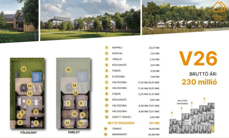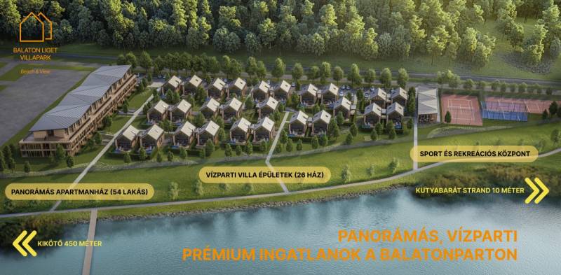 Balatonföldvár: Balatonföldvár fontos turisztikai célpont, nemcsak a magyarok, hanem más európai országok turistái számára is, természeti szépségei (például a löszhegy és a nagy virágos parkok), továbbá történelmi örökségei (például a kelta ösvény, a régi kúriák és villák) miatt számtalan szabadidős lehetőséget, valamint számos vízi sportot (vitorlázás, szörfözés, horgászat, evezés)Villák - kulcsrakész alapfelszereltség:100% tömör CLT Ausztriából.20 cm kőzetgyapot hőszigetelés.A+ energetikai besorolás.Fa hőszigetelő nyílászárók 3 rétegű üvegezéssel, tölgyfurnér melegburkolat.Porcelán greslap hidegburkolat.Villeroy fürdőszoba szaniterek,padlófűtés.Levegős hőszivattyú (VRV splitklíma), 2,5 kW napelem rendszer, elektromos redőny, szúnyogháló, beépített bútorok, homlokzati díszvilágítás.min. 26 m² teraszmin. 62 m² magánkert.Villák - választható opciók:Prémium konyhabútor konyhaszigettel, okosotthon rendszer, szauna (épületen belül), látvány design kandalló, 4 személyes prémium jacuzzi, gázos grillsütő.Privát zárt parkoló: 6.350.000. Ft.Privát elektromos autótöltő, kedvezményes hajóhely az új e-kikötőben.V.26.A további kérdésekkel és a megtekintéssel kapcsolatban kérem keressen a megadott mobil számon.