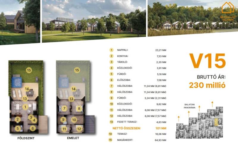 Balatonföldvár: Balatonföldvár fontos turisztikai célpont, nemcsak a magyarok, hanem más európai országok turistái számára is, természeti szépségei (például a löszhegy és a nagy virágos parkok), továbbá történelmi örökségei (például a kelta ösvény, a régi kúriák és villák) miatt számtalan szabadidős lehetőséget, valamint számos vízi sportot (vitorlázás, szörfözés, horgászat, evezés)Villák - kulcsrakész alapfelszereltség:100% tömör CLT Ausztriából.20 cm kőzetgyapot hőszigetelés.A+ energetikai besorolás.Fa hőszigetelő nyílászárók 3 rétegű üvegezéssel, tölgyfurnér melegburkolat.Porcelán greslap hidegburkolat.Villeroy fürdőszoba szaniterek,padlófűtés.Levegős hőszivattyú (VRV splitklíma), 2,5 kW napelem rendszer, elektromos redőny, szúnyogháló, beépített bútorok, homlokzati díszvilágítás.min. 26 m² teraszmin. 62 m² magánkert.Villák - választható opciók:Prémium konyhabútor konyhaszigettel, okosotthon rendszer, szauna (épületen belül), látvány design kandalló, 4 személyes prémium jacuzzi, gázos grillsütő.Privát zárt parkoló: 6.350.000. Ft.Privát elektromos autótöltő, kedvezményes hajóhely az új e-kikötőben.V.15.A további kérdésekkel és a megtekintéssel kapcsolatban kérem keressen a megadott mobil számon.