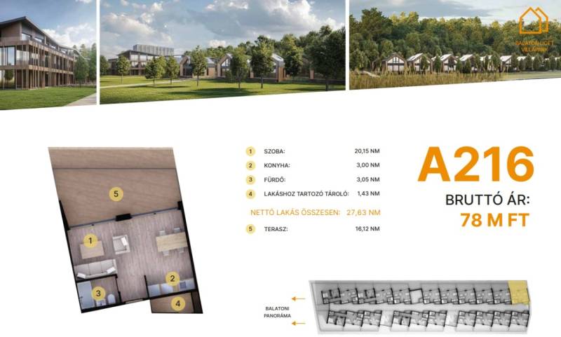Balatonföldvár: Balatonföldvár fontos turisztikai célpont, nemcsak a magyarok, hanem más európai országok turistái számára is, természeti szépségei (például a löszhegy és a nagy virágos parkok), továbbá történelmi örökségei (például a kelta ösvény, a régi kúriák és villák) miatt számtalan szabadidős lehetőséget, valamint számos vízi sportot (vitorlázás, szörfözés, horgászat, evezés)Balaton liget willapark:Lakások száma: 56 db.Alapterület: 28-56 m².A földszinti lakásokhoz saját, privát kert tartozik.A földszinten 21 lakás található, 48–110 m² közötti alapterülettel.Az első emeleten további 21 lakás érhető el, 47–75 m² közötti méretben.A második emeleten 17 lakás kapott helyet.A lakásokhoz önálló tárolóhelyiségek tartoznak, amelyek a közös folyosóról közelíthetők meg.Környezettudatos építő anyagokA+ energetikai besorolásFelszíni parkoló: 6.350.000. Ft.Modern letisztult építészet, tömegformálás, Balatonra tájolt panorámás teraszok.Apartmanlakás - alapfelszereltség:100% tömör CLT Ausztriából.20 cm kőzetgyapot hőszigetelés.Fa hőszigetelő nyílászárók 3 rétegű üvegezéssel,tölgyfurnér melegburkolat.Porcelán greslap hidegburkolat, villeroy fürdőszoba szaniterekpadlófűtés.Levegős hőszivattyú (VRV splitklíma), 50kW társasházi napelemrendszer, elektromos redőny, szúnyogháló beépített bútoroksaját terasz.Kedvező fizetési konstrukció: 10-90 %.A 216. lakás.A további kérdésekkel és a megtekintéssel kapcsolatban kérem keressen a megadott mobil számon.