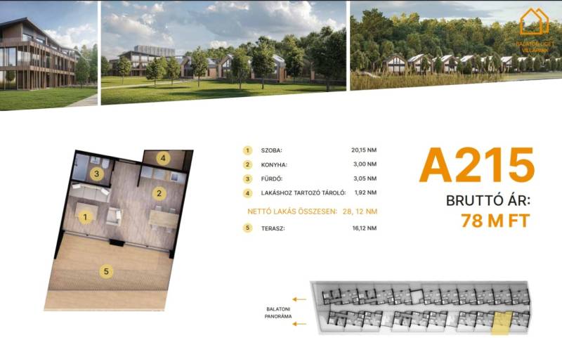 Balatonföldvár: Balatonföldvár fontos turisztikai célpont, nemcsak a magyarok, hanem más európai országok turistái számára is, természeti szépségei (például a löszhegy és a nagy virágos parkok), továbbá történelmi örökségei (például a kelta ösvény, a régi kúriák és villák) miatt számtalan szabadidős lehetőséget, valamint számos vízi sportot (vitorlázás, szörfözés, horgászat, evezés)Balaton liget willapark:Lakások száma: 56 db.Alapterület: 28-56 m².A földszinti lakásokhoz saját, privát kert tartozik.A földszinten 21 lakás található, 48–110 m² közötti alapterülettel.Az első emeleten további 21 lakás érhető el, 47–75 m² közötti méretben.A második emeleten 17 lakás kapott helyet.A lakásokhoz önálló tárolóhelyiségek tartoznak, amelyek a közös folyosóról közelíthetők meg.Környezettudatos építő anyagokA+ energetikai besorolásFelszíni parkoló: 6.350.000. Ft.Modern letisztult építészet, tömegformálás, Balatonra tájolt panorámás teraszok.Apartmanlakás - alapfelszereltség:100% tömör CLT Ausztriából.20 cm kőzetgyapot hőszigetelés.Fa hőszigetelő nyílászárók 3 rétegű üvegezéssel,tölgyfurnér melegburkolat.Porcelán greslap hidegburkolat, villeroy fürdőszoba szaniterekpadlófűtés.Levegős hőszivattyú (VRV splitklíma), 50kW társasházi napelemrendszer, elektromos redőny, szúnyogháló beépített bútoroksaját terasz.Kedvező fizetési konstrukció: 10-90 %.A 215. lakás.A további kérdésekkel és a megtekintéssel kapcsolatban kérem keressen a megadott mobil számon.