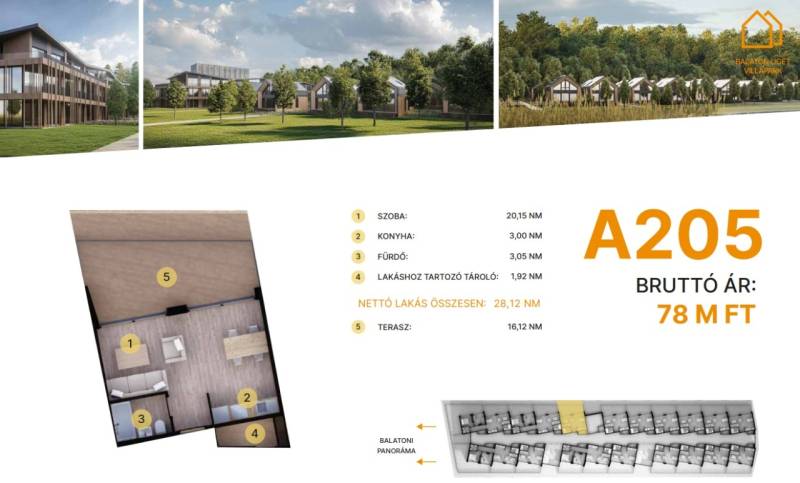 Balatonföldvár: Balatonföldvár fontos turisztikai célpont, nemcsak a magyarok, hanem más európai országok turistái számára is, természeti szépségei (például a löszhegy és a nagy virágos parkok), továbbá történelmi örökségei (például a kelta ösvény, a régi kúriák és villák) miatt számtalan szabadidős lehetőséget, valamint számos vízi sportot (vitorlázás, szörfözés, horgászat, evezés)Balaton liget willapark:Lakások száma: 56 db.Alapterület: 28-56 m².A földszinti lakásokhoz saját, privát kert tartozik.A földszinten 21 lakás található, 48–110 m² közötti alapterülettel.Az első emeleten további 21 lakás érhető el, 47–75 m² közötti méretben.A második emeleten 17 lakás kapott helyet.A lakásokhoz önálló tárolóhelyiségek tartoznak, amelyek a közös folyosóról közelíthetők meg.Környezettudatos építő anyagokA+ energetikai besorolásFelszíni parkoló: 6.350.000. Ft.Modern letisztult építészet, tömegformálás, Balatonra tájolt panorámás teraszok.Apartmanlakás - alapfelszereltség:100% tömör CLT Ausztriából.20 cm kőzetgyapot hőszigetelés.Fa hőszigetelő nyílászárók 3 rétegű üvegezéssel,tölgyfurnér melegburkolat.Porcelán greslap hidegburkolat, villeroy fürdőszoba szaniterekpadlófűtés.Levegős hőszivattyú (VRV splitklíma), 50kW társasházi napelemrendszer, elektromos redőny, szúnyogháló beépített bútoroksaját terasz.A 205. lakás.A további kérdésekkel és a megtekintéssel kapcsolatban kérem keressen a megadott mobil számon.