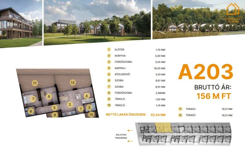 Balatonföldvár: Balatonföldvár fontos turisztikai célpont, nemcsak a magyarok, hanem más európai országok turistái számára is, természeti szépségei (például a löszhegy és a nagy virágos parkok), továbbá történelmi örökségei (például a kelta ösvény, a régi kúriák és villák) miatt számtalan szabadidős lehetőséget, valamint számos vízi sportot (vitorlázás, szörfözés, horgászat, evezés)Balaton liget willapark:Lakások száma: 56 db.Alapterület: 28-56 m².A földszinti lakásokhoz saját, privát kert tartozik.A földszinten 21 lakás található, 48–110 m² közötti alapterülettel.Az első emeleten további 21 lakás érhető el, 47–75 m² közötti méretben.A második emeleten 17 lakás kapott helyet.A lakásokhoz önálló tárolóhelyiségek tartoznak, amelyek a közös folyosóról közelíthetők meg.Környezettudatos építő anyagokA+ energetikai besorolásFelszíni parkoló: 6.350.000. Ft.Modern letisztult építészet, tömegformálás, Balatonra tájolt panorámás teraszok.Apartmanlakás - alapfelszereltség:100% tömör CLT Ausztriából.20 cm kőzetgyapot hőszigetelés.Fa hőszigetelő nyílászárók 3 rétegű üvegezéssel,tölgyfurnér melegburkolat.Porcelán greslap hidegburkolat, villeroy fürdőszoba szaniterekpadlófűtés.Levegős hőszivattyú (VRV splitklíma), 50kW társasházi napelemrendszer, elektromos redőny, szúnyogháló beépített bútoroksaját terasz.A 203. lakás.A további kérdésekkel és a megtekintéssel kapcsolatban kérem keressen a megadott mobil számon.