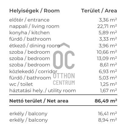 Ez a lakás:K,É,D-i tájolású, világos lakás a sétányra és a Dunára néző kilátással.A természetes fénnyel teli, ablakos konyha, a két fürdőszoba és a praktikus háztartási helyiség a kényelmes mindennapokat szolgálja.A lakáshoz két terasz tartozik: egyik a nappaliból, másik az egyik hálószobából nyílik, ideális elrendezést kínálva a közös és a privát terek elkülönítésére.Az egyik hálószoba saját fürdőszobával rendelkezik, ami valódi prémium komfortot ad a lakásnak.Projekt bemutatásaDuna Residence | átadás: 2027 tavaszHazaérkezni ide olyan érzés, mintha lelassulna a világ.Ez az Újbudai Duna-part jelenleg több ütemben épülő, de szolgáltatásaiban legerősebb lakóparkja. Az épületben saját fitneszterem és wellness vár – úgy töltekezel, mintha minden nap egy hotelbe érkeznél haza.4 OK, AMIÉRT JÓ VÁLASZTÁS✔ belváros közeli elhelyezkedés, kiváló közlekedés✔ zöld, nyugodt környezet – valódi városi oázis✔ prémium szolgáltatások egy helyen✔ alacsony fenntartási költségekFELSZERELTSÉG (az ár tartalmazza):- Padlófűtés + fan-coil hűtés: a két legkényelmesebb megoldás, amire mindenki vágyik - Elektromos redőnyök- Érintős villanykapcsolók- Egyedi fejlesztésű Smart Home rendszer, amely saját applikációról vezérelhető (fűtés, hűtés, világítás, árnyékolás)Miért válaszd ezt a különleges otthont?- Saját wellness van a házban: medence, szaunavilág, sókabin, fitnessterem – úgy töltekezel, mintha minden nap egy hotelbe érkeznél haza.- Minden parkoló töltővel: a lakópark teljesen elektromos-autó-baráttá lett tervezve, minden beálló töltésre előkészített.- A lakások 70%-ából látható a Duna és a budai hegek- Tényleg jól használható elosztás: praktikus, jól élhető, modern kialakítás a beruházótól megszokott magas színvonalon.SZOLGÁLTATÁSOK, amelyek valóban kényelmessé teszik az életetA Duna Residence-ben sokszor ki sem kell lépned, ha feltöltődésre vágysz:- modern fitneszterem- szauna és wellness funkciók- kültéri edzőeszközök- közösségi csónakház- grill- és tűzrakóhely- panorámás tető- és napozóteraszok- zárt, autómentes belső park- játszóterek, baba- és gyerekbarát terek- bölcsőde és óvoda a lakóparkon belül- pékség és kávézó a fogadóépületbenA biztonságról 24 órás portaszolgálat és ellenőrzött beléptetés gondoskodik arcfelismerő rendszerrel.Az energetikai kialakítás megfelel a kiemelkedően alacsony energiaigényű otthonok követelményeinek – ez nemcsak kényelmet, hanem hosszú távú értékállóságot is jelent.A tetőszinti panorámateraszokról a Duna, a város és a naplemente látványa tárul fel. Itt lehet igazán megállni egy pillanatra: reggel egy kávéval, délután egy könyvvel, este a fényekkel együtt lelassulva.FEJLESZTŐI HÁTTÉR – megbízhatóság, garanciávalA projekt mögött az egyik legmegbízhatóbb hazai fejlesztő áll, amely garantálja a kivitelezés minőségét és biztonságát:- Fix ár: A szerződésben rögzített vételár garantált – rejtett költségek és utólagos áremelés nélkül- 5% rozsdaövezeti kedvezmény*- Prémium minőség: Magas színvonalú anyagok és innovatív megoldások- Saját kivitelezés: A teljes folyamat egy kézben, kiemelkedő minőségbiztosítással- Teljes körű jótállás, hosszú távú elégedettséggel- Kedvező fizetési ütemezés – 10% szerződéskötéskor, a fennmaradó 90%-ot elegendő csupán az átadáskor megfizetnedAZ ÉPÍTKEZÉS AKTUÁLIS STÁTUSZA 2026-01-29A szerkezetépítés már a 10. emeleten történik. A falazás a 8. emeleten holnaptól folytatódik. A homlokzati nyílászárók beépítése a 7. emeleten elkészült.A belső vakolás a 4. emeleten zajlik, az aljzatbetonozás az 5. emeletig befejeződött. A földszinten a festési munkák elkészültek, a 2. és 3. emeleteken jelenleg glettelés folyik. Emellett a földszinti és az 1. emeleti lakásokban a hidegburkolási munkák is folyamatban vannak.KÖZLEKEDÉS– a város kényelmévelPár lépés a folyó, esti séták a Duna-parton, nyugalom és tér – mindez anélkül, hogy lemondanál a városi elérhetőségről. A belváros autóval mindössze 15 perc, tömegközlekedéssel is gyorsan és kényelmesen elérhető. A 133E és a 103-as busz megállói egy percre találhatók, a 4-es metró Bikás parki állomása néhány perc alatt elérhető.El tudod magad itt képzelni? Akkor ez a különleges lakópark épp Rád vár! Otthon a városban. Otthon a Duna-parton.2027 tavaszán – itt kezdődik az új fejezeted.* Rozsdaövezeti kedvezmény: magyar magánszemélyek a tulajdonjog bejegyzését követően a vételár 5% ÁFÁ-ját visszaigényelhetik.----------------------------------------------------------------------------Díjmentes, bankfüggetlen hiteltanácsadással támogatjuk vevő ügyfeleinket a számukra legelőnyösebb finanszírozási döntések meghozatalában. Opcionálisan igénybe vehető kiegészítő szolgáltatásainkkal – mint ügyvédi közreműködés, energetikai tanúsítvány vagy villamos biztonsági felülvizsgálat – teljes körű szakmai támogatást nyújtunk az adásvétel folyamatának minden egyes lépésénél.A hirdetésben szereplő információk tájékoztató jellegűek. A tévedés és az árváltoztatás jogát fenntartjuk. Az esetleges elírásokért és technikai hibákért felelősséget nem vállalunk.