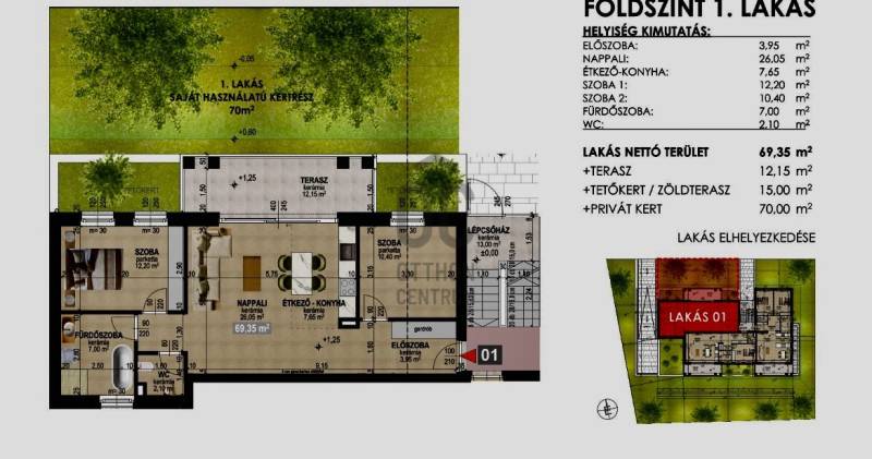Debrecen egyik legkedveltebb és legértékállóbb városrészén, a Nagyerdő lábánál, eladásra kínálok egy 6 lakásos, modern társasházat, amely a minőséget, a letisztult eleganciát és magas műszaki tartalmat képvisel.Az ingatlan prémium kivitelezéssel, korszerű műszaki megoldásokkal és átgondolt tervekkel készül.A társasház nyugodt, csendes környezetben helyezkedik el, mégis kiváló infrastrukturával a Nagyerdő közelsége különleges életérzést biztosít.A földszinti lakások egyedi arculata a tágas nappali, melyet a teraszra nyíló hatalmas hőszigetelt nagy ablak borítja, így a természet mindig karnyújtásnyira van.A társasház főbb jellemzői:- Az épület három szintre tagolható: pinceszint + földszint + emeleti szint- A pinceszinten 6 db. gépkocsi beálló valamint önálló tárolóhelyiségek található- Az épületben szintenként 3-3 kiválóan berendezhető lakás helyezkedik el- A lakásokhoz loggiák és teraszok kapcsolódnak- Csendes kertvárosias környezet- Parkosított zöld felületek a telkenLakások kialakítása:- Földszinti lakásokhoz saját kert, zöld terasz és fedett terasz tartozi.- Emeleti lakásokhoz loggiák tartoznak.Földszint 1 lakás: 69.3 nm + 12.15 nm terasz + 15 nm zöld terasz + 70 nm privát kertFöldszint 2 lakás: 57.65 nm + 12.15 nm terasz + 39.8 nm zöld terasz + 167 nm privát kertFöldszint 3 lakás: 69.75 nm + 12.15 nm terasz + 177 nm privát kertEmeleti lakások:Emelet 4 lakás: 69.35 nm + 11.35 nm loggiaEmelet 5 lakás: 57.65 nm + 11.35 nm loggiaEmelet 6 lakás: 69.75 nm + 11.35 nm loggiaMűszaki tartalom:- Prémium minőségű Pannontherm ALU-FA nyílászárók, extra nagyméretű emelő-toló erkélyajtókkal és üvegfelületekkel- Pannontherm - Stemeseder prémium Zsaluzia árnyékolás a nyílászárókkal harmonizáló színben- 3 rétegű hőszigetelt üvegezés- 20 cm vastagságú homlokzati szigetelés- Fan-coll hőszivattyús hűtés- Padlófűtéses hőleadás a lakás minden helyiségében- Levegő-víz hőszivattyús fűtés rendszer- Prémium anyaghasználatA lakások CSOK Pluszra és hitelre alkalmasak.Amennyiben az ingatlan felkeltette érdeklődését, kérdése van, vagy szeretné megtekinteni, hétvégén is szívesen fogadom hívását!
